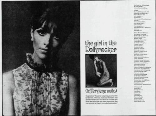 Dollyrockers advertisement showing Renee Shaw as a stockist, 1966