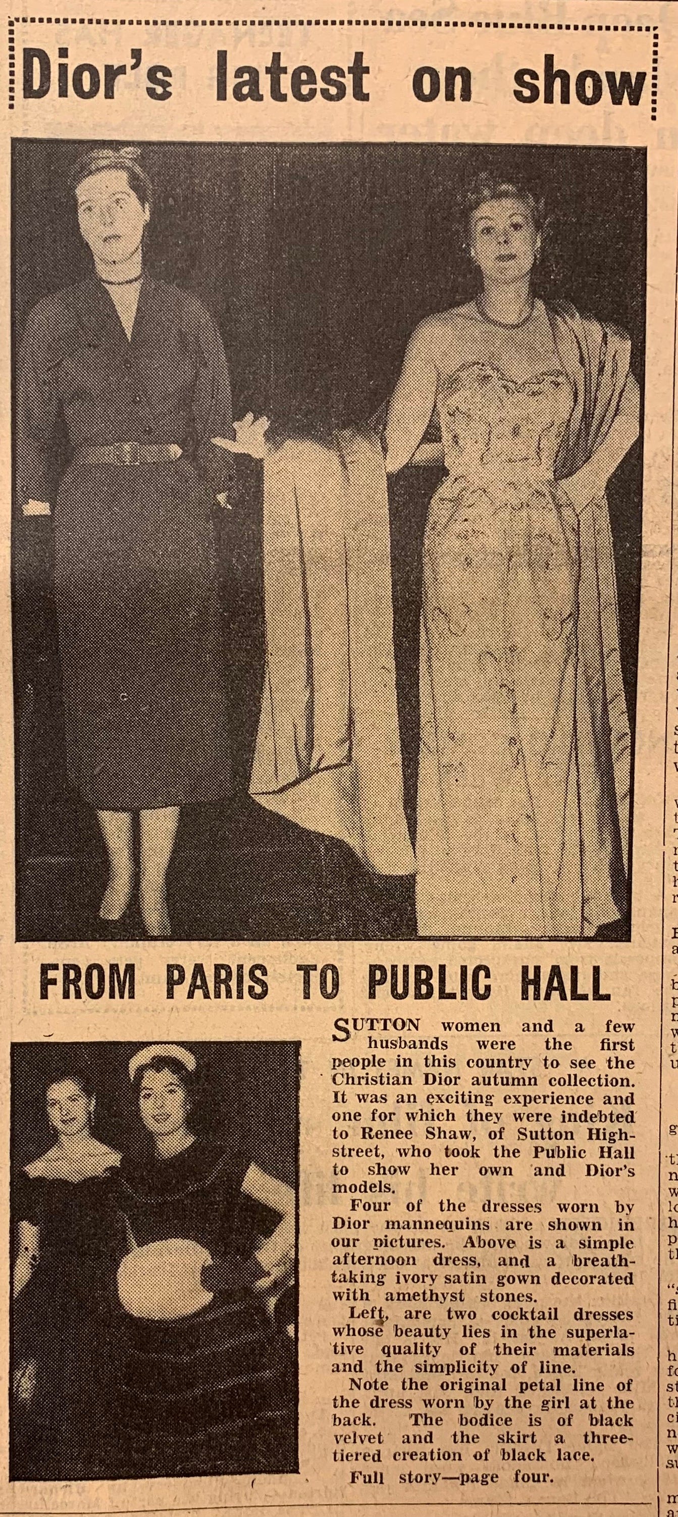 One parade, organised by Renee Shaw at Sutton Public Hall in 1953, was particularly noteworthy and made the local front-page news. This event featured couture dresses by Christian Dior, marking the ‘first’ showing of Dior’s 1953 Autumn collection in Britain, alongside garments ‘made in Renee Shaw’s workrooms’. The article does not clarify how Irene managed to procure these garments. However, what is particularly interesting is how this show acted to promote Renee Shaw. By showcasing the shop’s own garments alongside couture, it enhanced the cultural capital of Renee Shaw’s items, aligning them with Dior and suggesting that they were akin to couture.