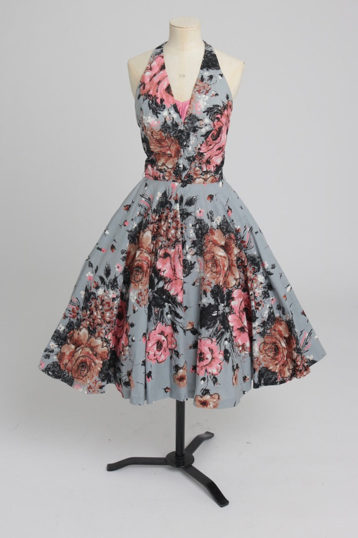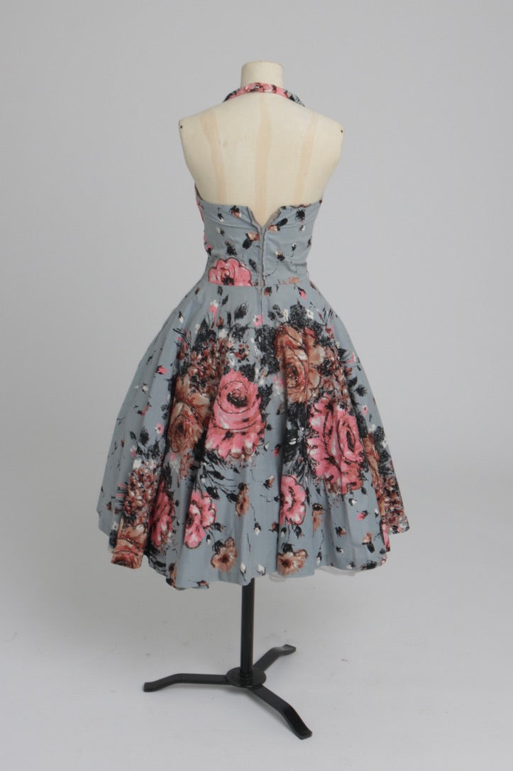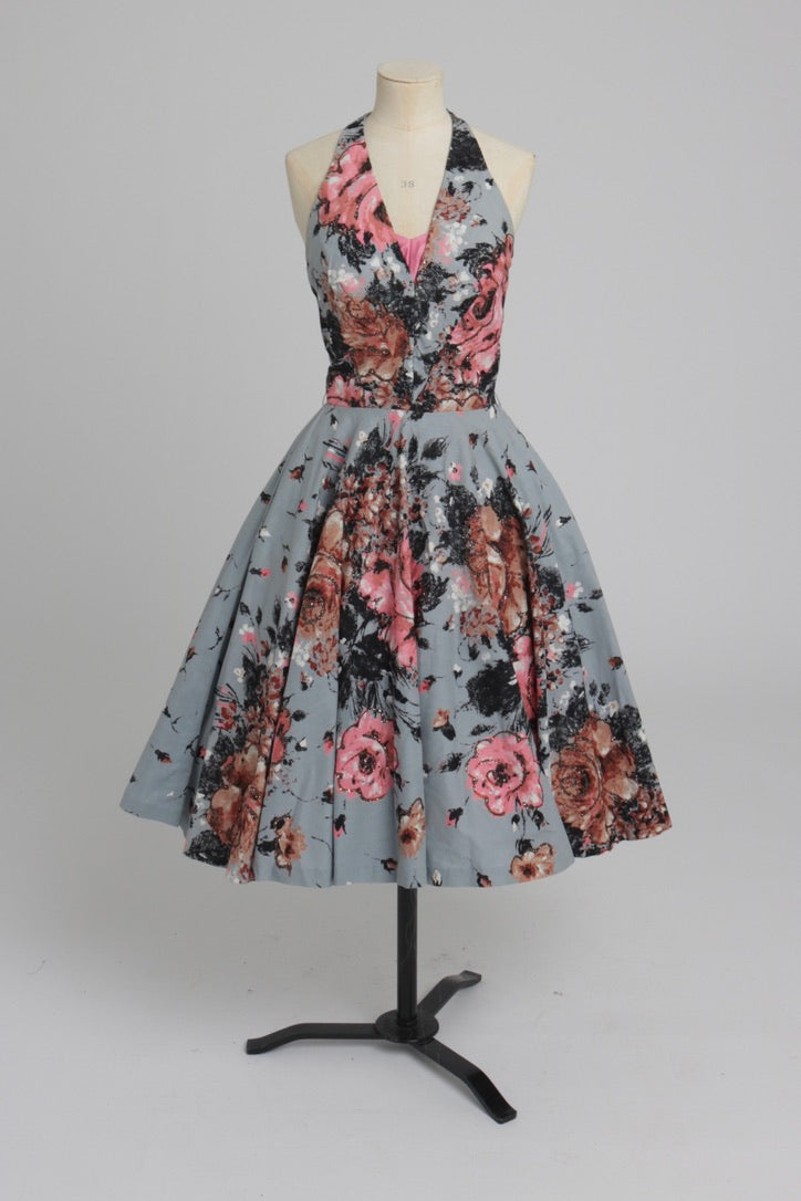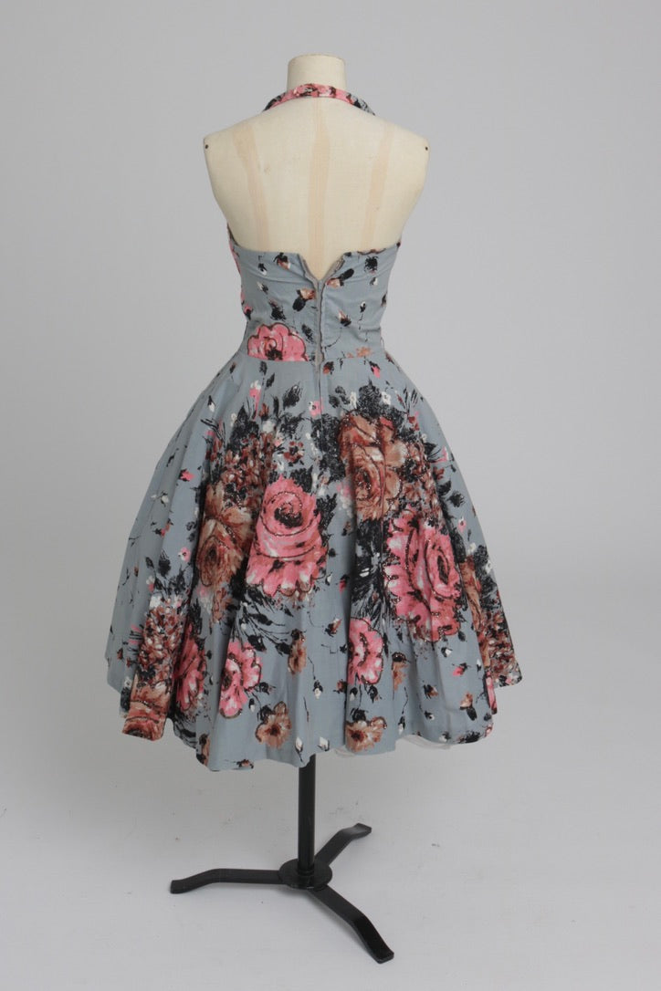 Vintage 1950s original floral rose print glitter accent cotton dress by Jackie Morgan UK 6 8 XS S